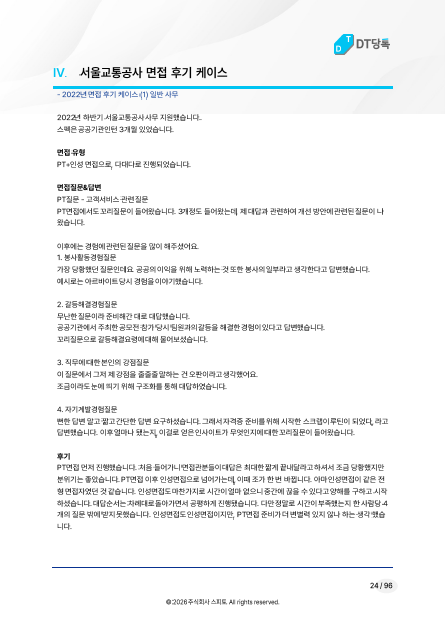 최근 3개년 면접 진행 방식 분석이 정말 꼼꼼합니다. 서울교통공사 경영 이슈와 철도 안전 관련 최신 이슈 정리도 면접에서 바로 활용했어요. 면접 흐름을 미리 파악할 수 있어서 긴장이 훨씬 줄었습니다!